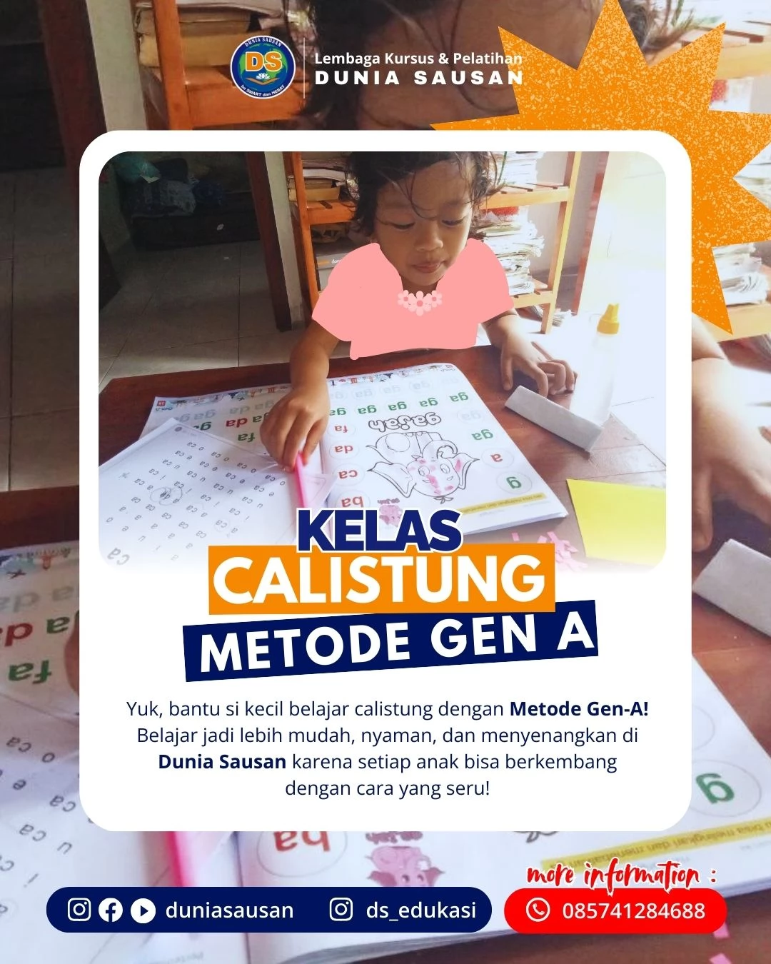 Belajar membaca, menulis, dan berhitung kini lebih mudah, cepat, dan menyenangkan dengan Metode Gen A berbasis STIFIn, khusus untuk anak usia 4–7 tahun. Dunia Sausan menghadirkan layanan Les Calistung Kudus Terdekat dan Terbaik dengan pendekatan belajar sesuai gaya kecerdasan alami anak.